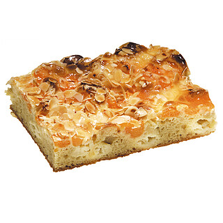 Lockere Joghurtmasse dressiert auf feinem Rührteigkuchen und mit fruchtigen Mandarinenstücken belegt, abgerundet mit einem Dekor aus gehobelten Mandeln.