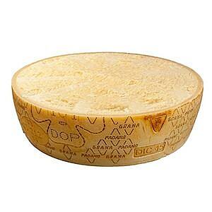 Dieser Grana Padano ist bis 14 Monate gereift, das verleiht ihm den einzigartigen Geschmack und das intensive Aroma. Hier im Horizontalschnitt, um im Käselaib Pasta al Grana zuzubereiten.