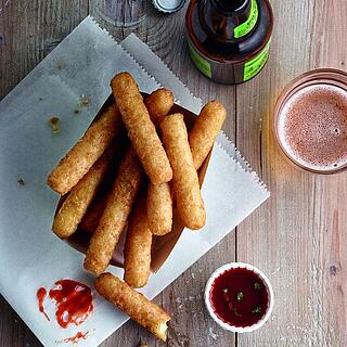 Käseklassiker mit Charakter: Mozzarella Sticks mit unverwechselbarer süßlicher Würze. Diese verdanken Sie dem 11 %igen Bieranteil im goldbraunen Teig. Die Sticks enthalten keinen Alkohol mehr, vorgebacken!